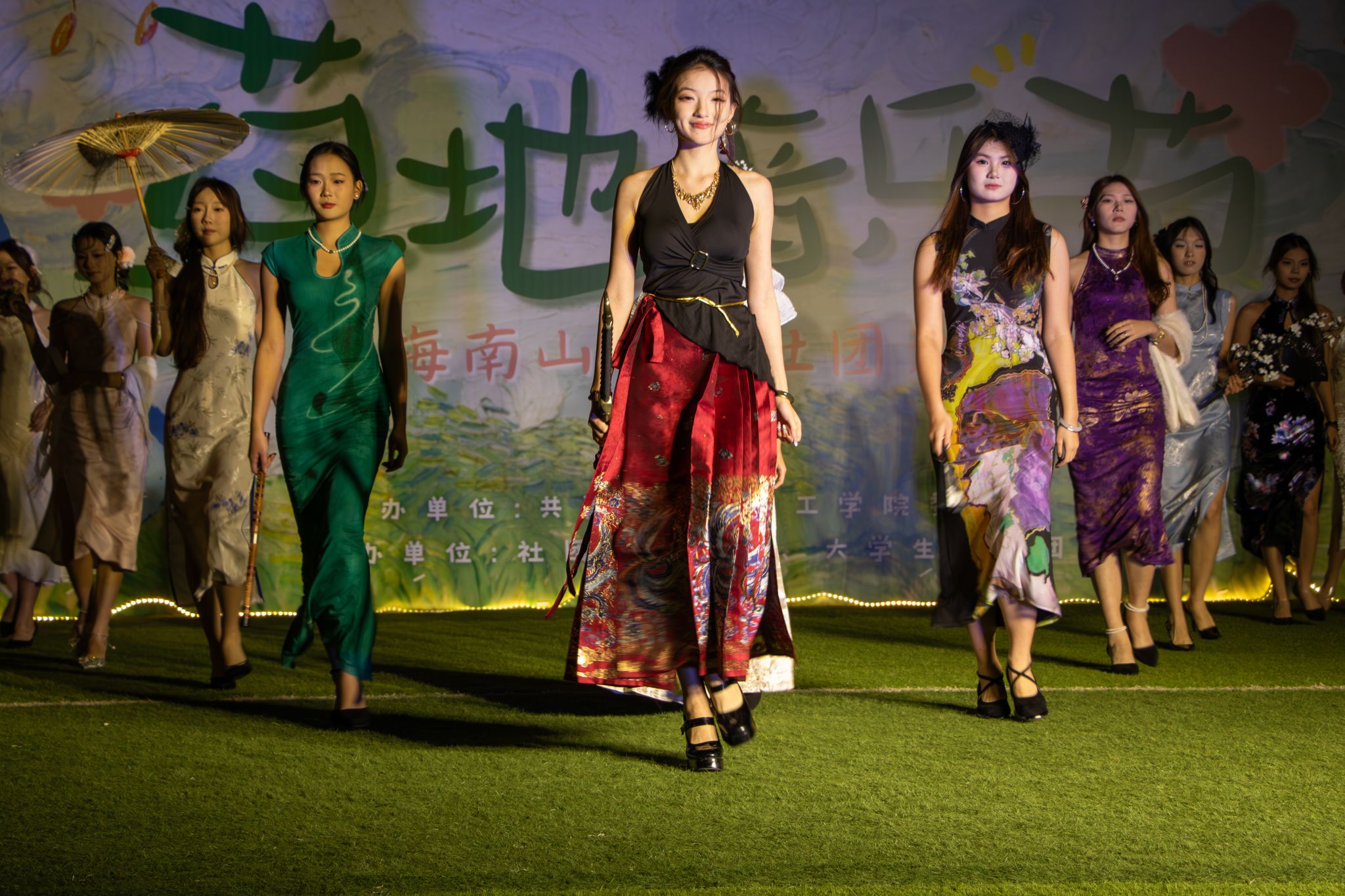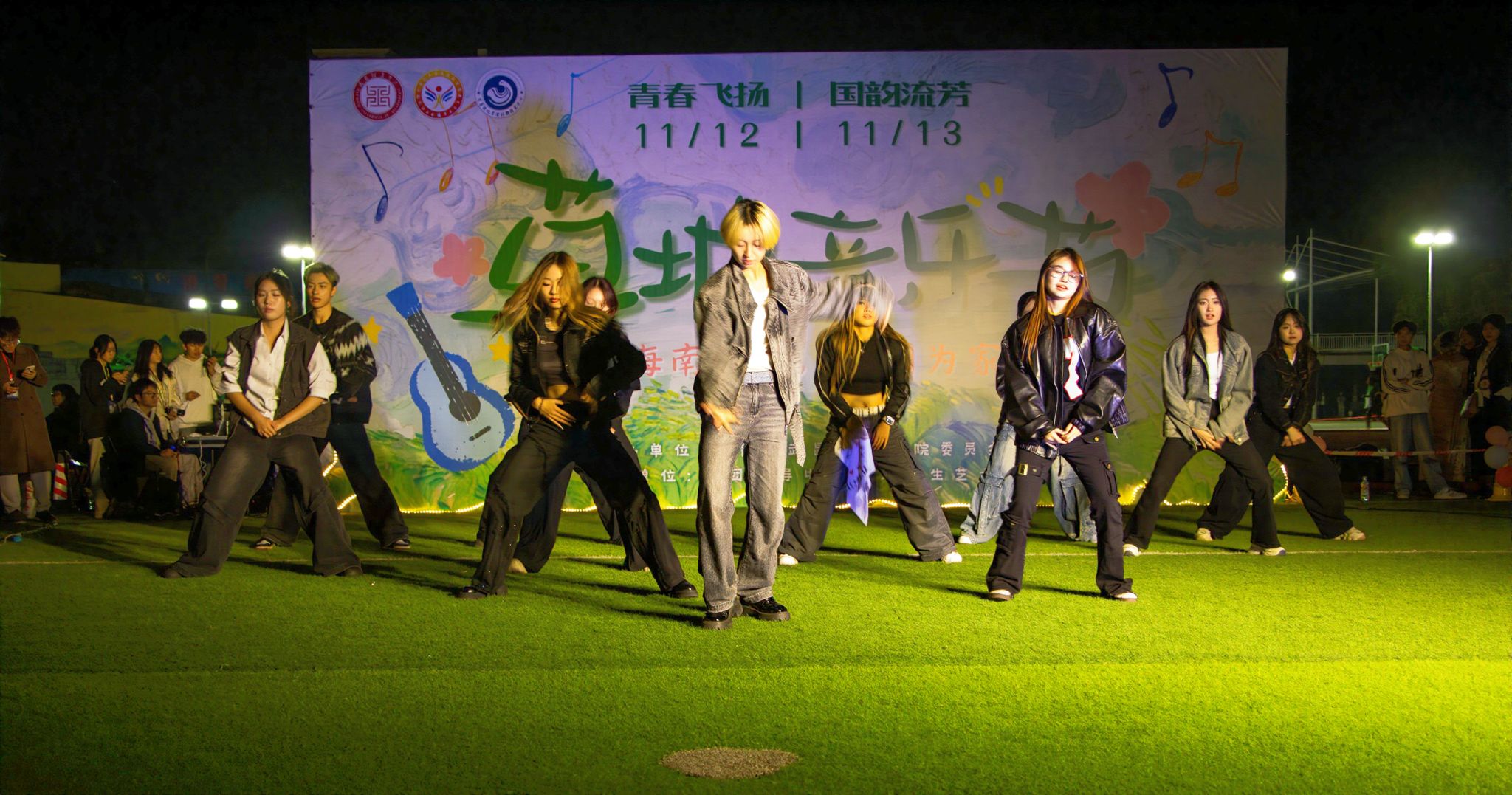 伴随着同学们的热烈掌声与欢呼声,首先活动正式拉开帷幕。首先登场的乐队所演奏的《不再犹豫》由一段极具辨识度的吉他riff直接将现场氛围调动了起来;紧随其后的是《Burning up》舞蹈,舞者们用充满力量的舞步展现着青春的活力;复贤国学社带来的《秀启风华》古风走秀,模特身着交领襦裙、曲裾深衣等精美汉服,手持团扇、油纸伞款款而行,鬓边簪花映着灯光,古典美学与现代舞台碰撞出别样火花;随后,方言小游戏等互动小游戏等互动环节趣味十足,在欢声笑语中传递地域文化魅力,而大学生艺术团带来的《方的言》也让 “方言里的乡愁” 与国韵主题深深呼应。武术协会的表演环节更是高潮迭起,表演者招式利落、气韵贯通,将中华武术的刚劲风骨展现得淋漓尽致,台下观众屏息凝神,结束后爆发出雷鸣般的掌声。《手心的蔷薇》《我只在乎你》等兼具柔情与力量的歌曲接连登台,《THUNDER》《so cool》等动感舞蹈穿插其间,传统韵味与青春活力无缝衔接,持续推高现场氛围;临近尾声,《晚安》的温柔旋律缓缓流淌,全场学子齐声合唱,温暖的歌声在夜空回荡,为 “国韵雅集” 篇章画上圆满句号。